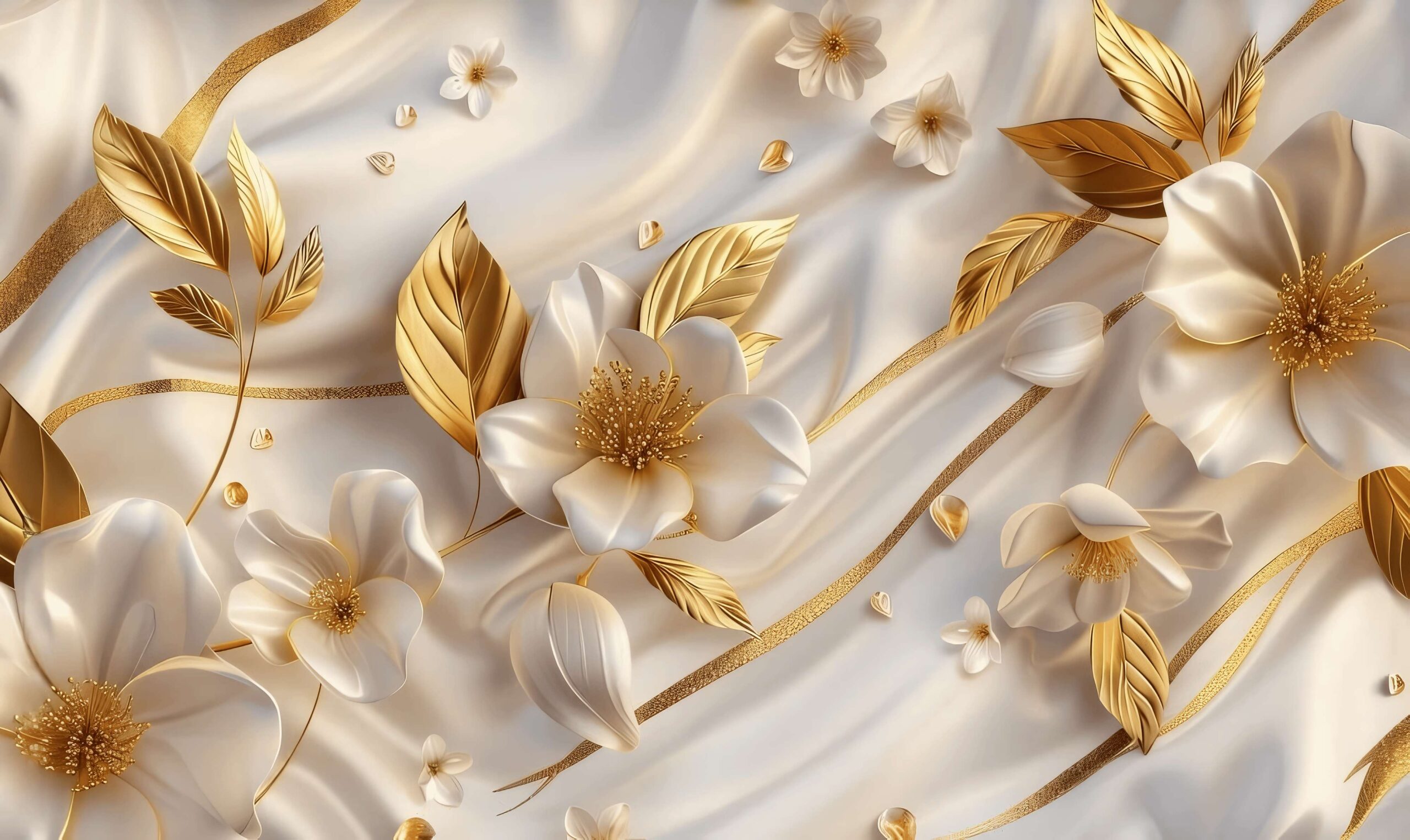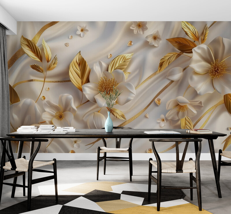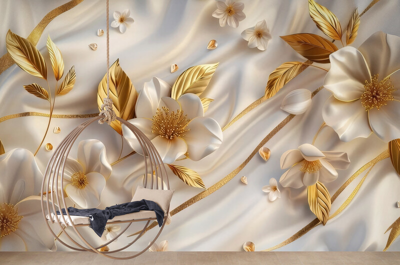 Fototapeta w kolorach białym i złotym, bezszwowa fototapeta 3D z kwiatami "Złote Kwiaty"