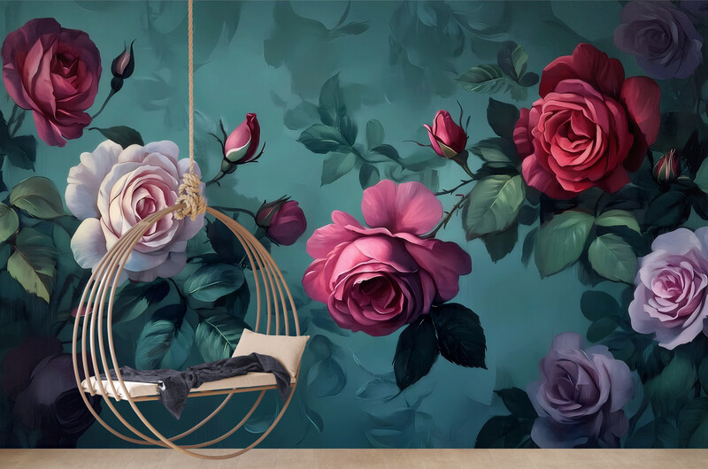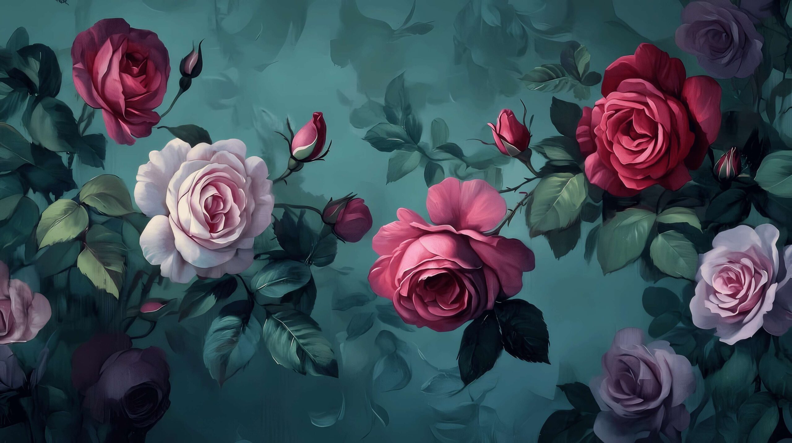 Fototapeta z różami do salonu, bogata kwiatowa fototapeta w odcieniach zieleni "Krzew Róży"