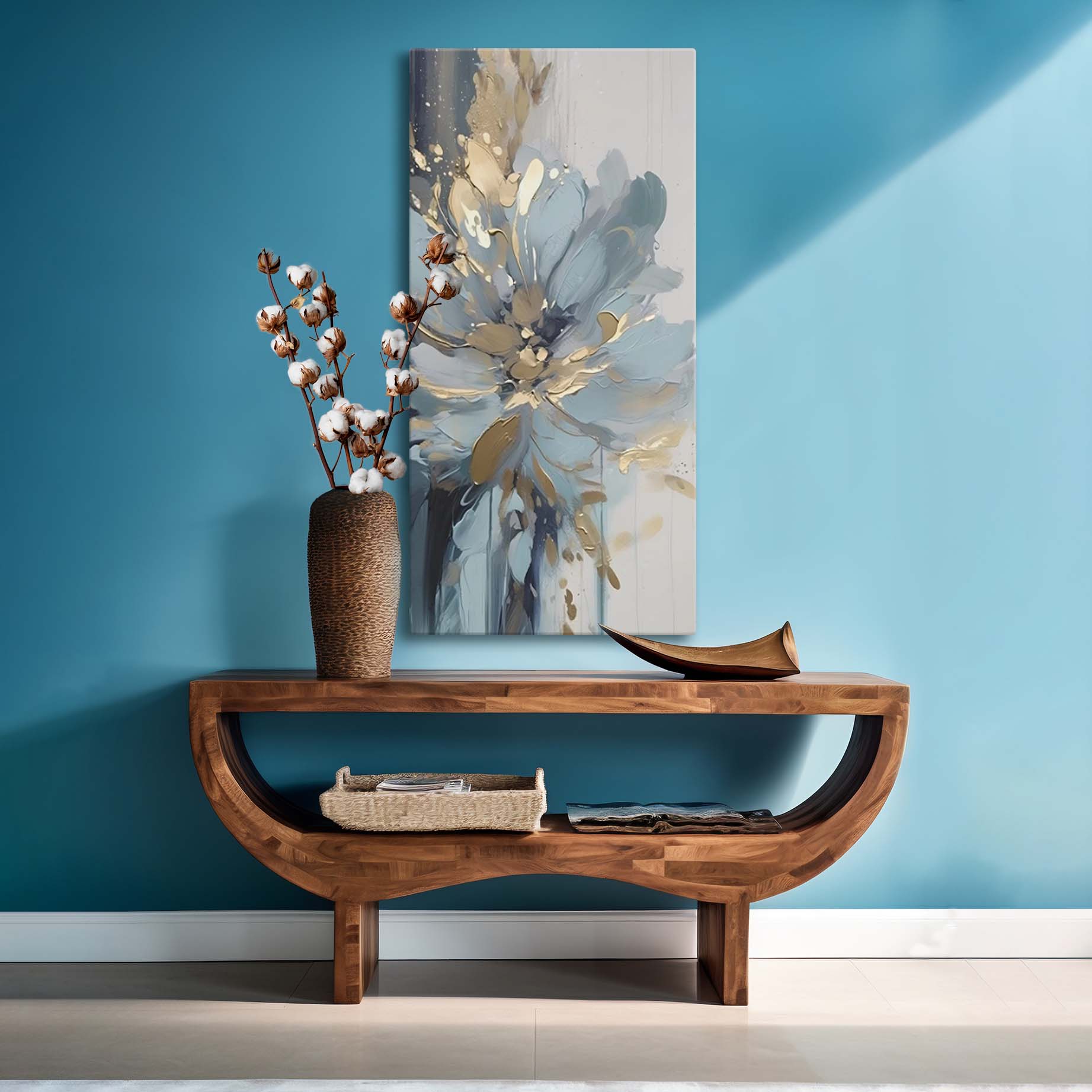 Obraz designerski z kwiatami w nowoczesnej ramie, obraz na płótnie do wnętrza w ramie "Kwiat niebieski i złoty"