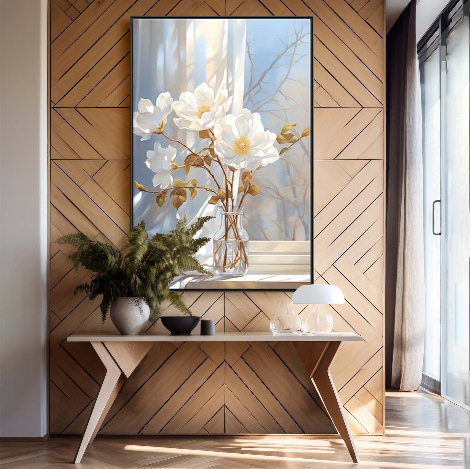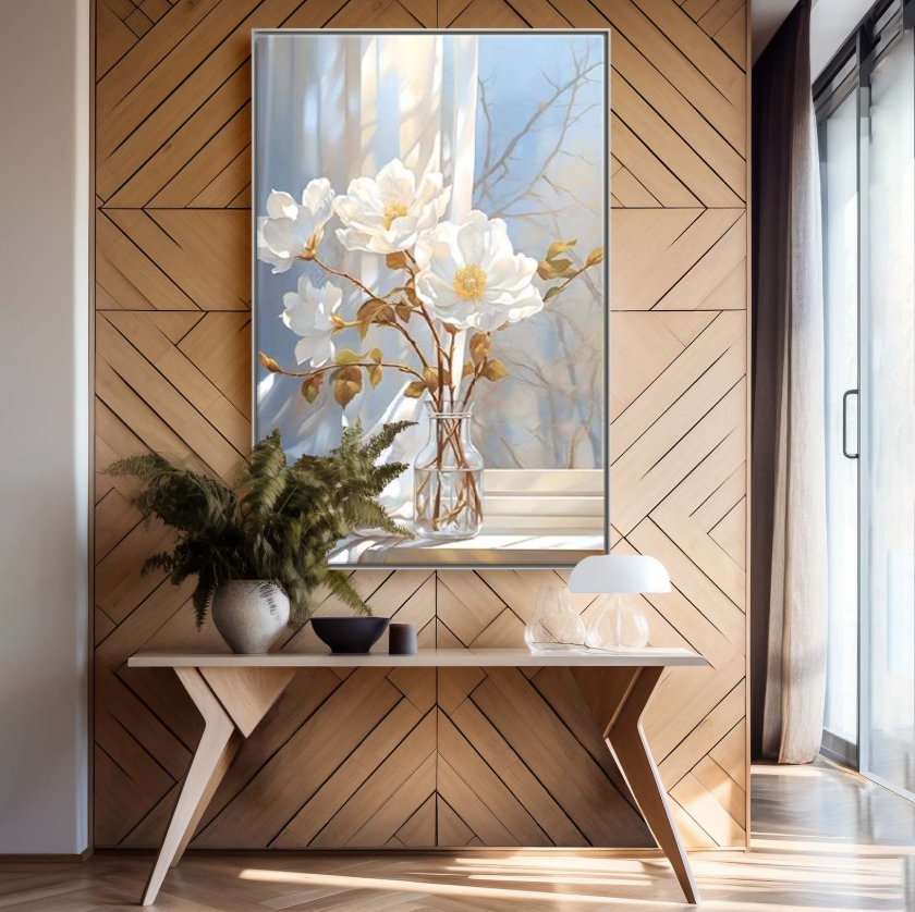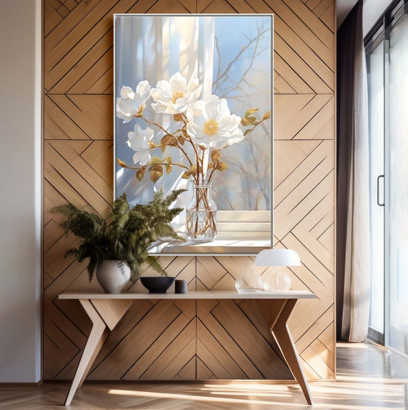 Obraz do wnętrza w ramie z kwiatami, obraz na płótnie w przedpokoju w ramie "Delikatne białe kwiaty w wazonie"